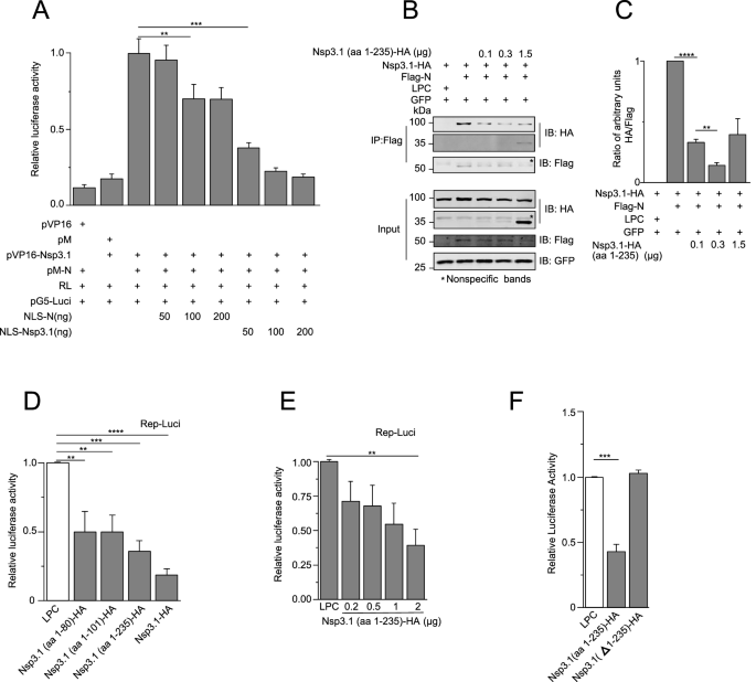 实验目的是明确Nsp3.1与N蛋白的相互作用对SARS-CoV-2复制的调控功能,评估其作为抗病毒药物靶点的潜力。方法细节为:构建S基因替换为荧光素酶的SARS-CoV-2复制子(Rep-Luci),在HEK293T细胞中共转染复制子与Nsp3.1截短体质粒,通过双荧光素酶报告系统检测复制子的活性;构建带有核定位序列(NLS)的N或Nsp3.1质粒,竞争性抑制两者在细胞内的相互作用,检测复制子活性的变化。结果解读:Nsp3.1可显著抑制复制子的荧光素酶活性,其N端aa1-235区域是抑制作用的关键,且抑制效果呈剂量依赖性(P<0.0001,n=3);带有NLS的N或Nsp3.1可竞争性抑制两者的相互作用,导致复制子活性显著降低;Nsp3.1的Δaa1-235截短体失去了对复制子的抑制作用,进一步证实该区域是调控病毒复制的关键位点。产品关联:文献未提及具体实验产品,领域常规使用病毒复制子系统、双荧光素酶检测试剂盒、核定位序列标签载体等。