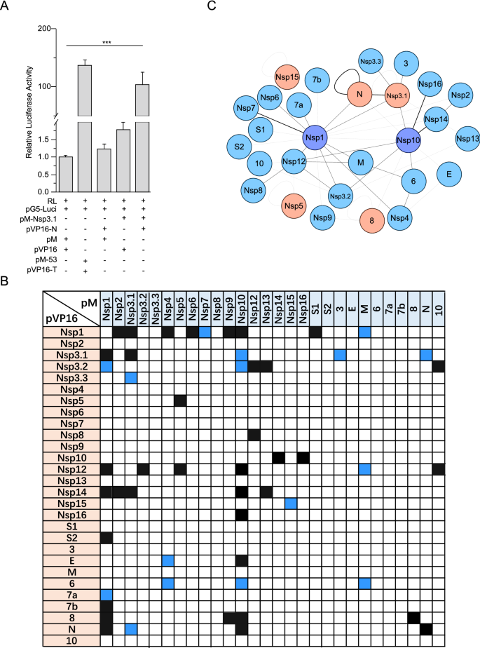 实验目的是全基因组范围筛选SARS-CoV-2病毒蛋白间的两两相互作用,构建完整的病毒蛋白相互作用网络。方法细节为:将SARS-CoV-2的28个病毒蛋白(其中Nsp3按功能域分为Nsp3.1、Nsp3.2、Nsp3.3三个截短体,S蛋白按弗林蛋白酶切割位点分为S1、S2)分别克隆到pM(结合域载体)和pVP16(激活域载体),在HEK293T细胞中进行两两共转染,同时转染pG5-Luci报告质粒和pRL-TK内参质粒,通过双荧光素酶报告系统检测相互作用,每个组合重复至少3次;采用免疫印迹(WB)验证载体中蛋白的表达,并用免疫共沉淀(Co-IP)验证部分阳性相互作用。结果解读:共检测到48个阳性相互作用,其中14个为未被报道的新相互作用;与SARS-CoV的Nsp1不同,SARS-CoV-2的Nsp1具有最多的相互作用伴侣(9个非结构蛋白和7个辅助蛋白),提示其作为病毒蛋白枢纽在复制复合物组装中的核心作用;5个自相互作用(ORF8、N、Nsp15、Nsp5、Nsp3)被确认,5个相互作用(Nsp1/Nsp3.1、Nsp3.1/N、Nsp3.2/Nsp12、Nsp10/Nsp14、Nsp10/Nsp16)为双向阳性;通过Cytoscape软件构建的相互作用网络显示,Nsp1和Nsp10是关键的枢纽蛋白,Co-IP实验进一步验证了包括Nsp3.1-N在内的多个相互作用的真实性。产品关联:文献未提及具体实验产品,领域常规使用双荧光素酶检测试剂盒、免疫沉淀琼脂糖珠、Flag/HA标签抗体等试剂。