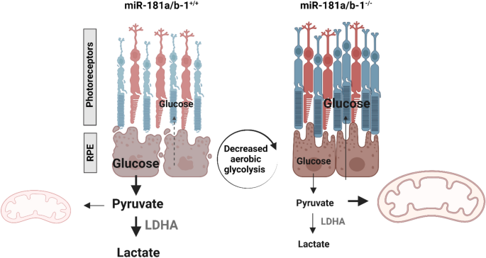 本研究的创新价值在于,首次揭示了miR-181a/b在视网膜色素变性进展中神经视网膜与视网膜色素上皮的相反表达模式,首次证实视网膜色素上皮中miR-181a/b-1敲除后miR-181a/b-2的代偿调控作用,同时明确了视网膜色素上皮特异性下调miR-181a/b通过抑制有氧糖酵解改善疾病表型的代谢机制,弥补了现有研究在细胞特异性和代谢机制解析上的不足。
