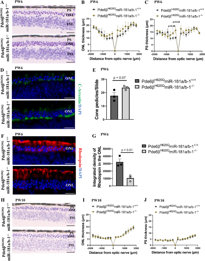方法细节:分别在PW6和PW10对实验组和对照组小鼠进行表型检测,包括组织学分析、视网膜电图(ERG)检测、免疫荧光染色。组织学分析采用苏木精-伊红(H&E)染色,测量视网膜外核层(ONL)厚度和光感受器外节长度;ERG检测评估视网膜的光反应功能;免疫荧光染色采用视紫红质抗体标记视杆细胞,C-Arrestin抗体标记视锥细胞,分析光感受器的形态和数量。