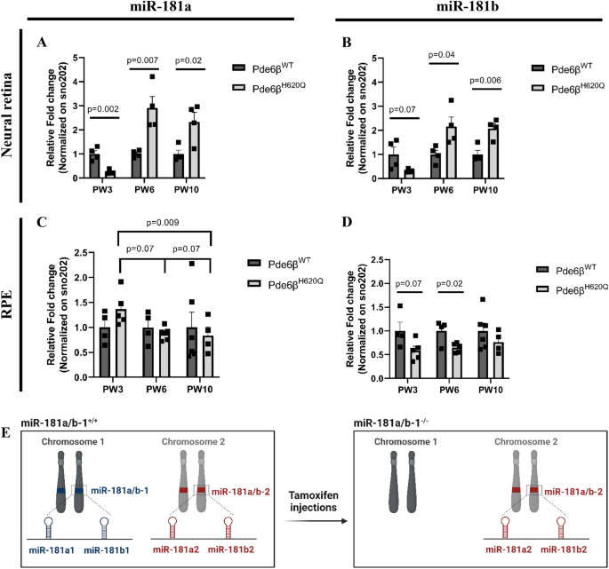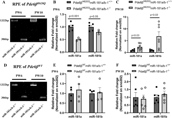 方法细节:分别在小鼠出生后第3周(PW3,疾病早期)、第6周(PW6,疾病中期)、第10周(PW10,疾病晚期)处死野生型和视网膜色素变性小鼠,分离神经视网膜和视网膜色素上皮组织,提取总RNA,采用TaqMan微小RNA检测试剂盒进行实时荧光定量PCR(qPCR),检测miR-181a和miR-181b的表达水平,以sno202作为内参进行标准化。