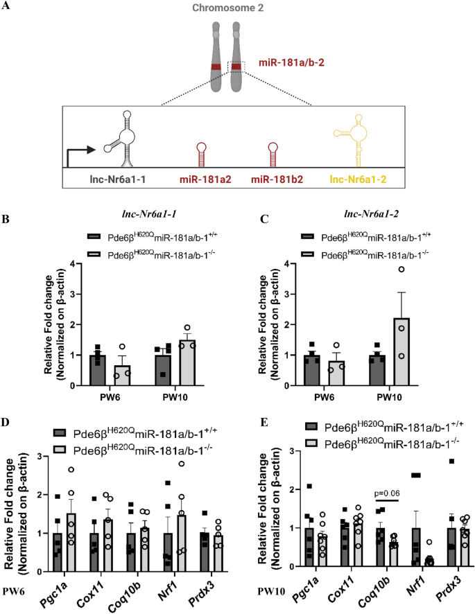 方法细节:分别在PW6和PW10处死实验组和对照组小鼠,分离视网膜色素上皮组织,提取总RNA,采用实时荧光定量PCR(qPCR)检测miR-181a、miR-181b的表达,同时检测miR-181a/b-2的宿主长链非编码RNA lnc-Nr6a1-1和lnc-Nr6a1-2的表达,以及miR-181a/b的线粒体相关靶基因(Nrf1、Cox11、Coq10b等)的表达水平;同时设置野生型背景的视网膜色素上皮特异性miR-181a/b-1敲除小鼠作为对照,排除疾病背景的影响。