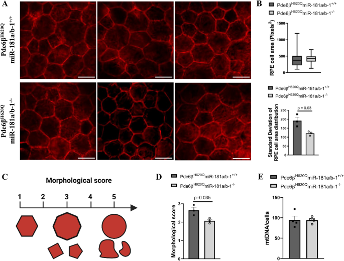 方法细节:将携带Pde6βH620Q突变的视网膜色素变性小鼠、Rpe65CreERT2诱导型重组酶小鼠、Mirc14tm1.1Czc(miR-181a/b-1 flox/flox)小鼠进行杂交,经过至少6代回交获得遗传背景一致的实验小鼠,实验组为纯合Pde6βH620Q、纯合miR-181a/b-1 flox/flox且杂合Rpe65CreERT2的小鼠,对照组为纯合Pde6βH620Q、纯合miR-181a/b-1 flox/flox且野生型Rpe65CreERT2的小鼠;在小鼠出生后第8-12天(P8-P12)进行两次腹腔注射他莫昔芬(0.1mg/g体重),诱导视网膜色素上皮中Cre重组酶的激活,从而敲除miR-181a/b-1;通过基因组实时荧光定量PCR(qPCR)验证miR-181a/b-1的敲除效率,同时检测神经视网膜中的敲除情况以确认细胞特异性。