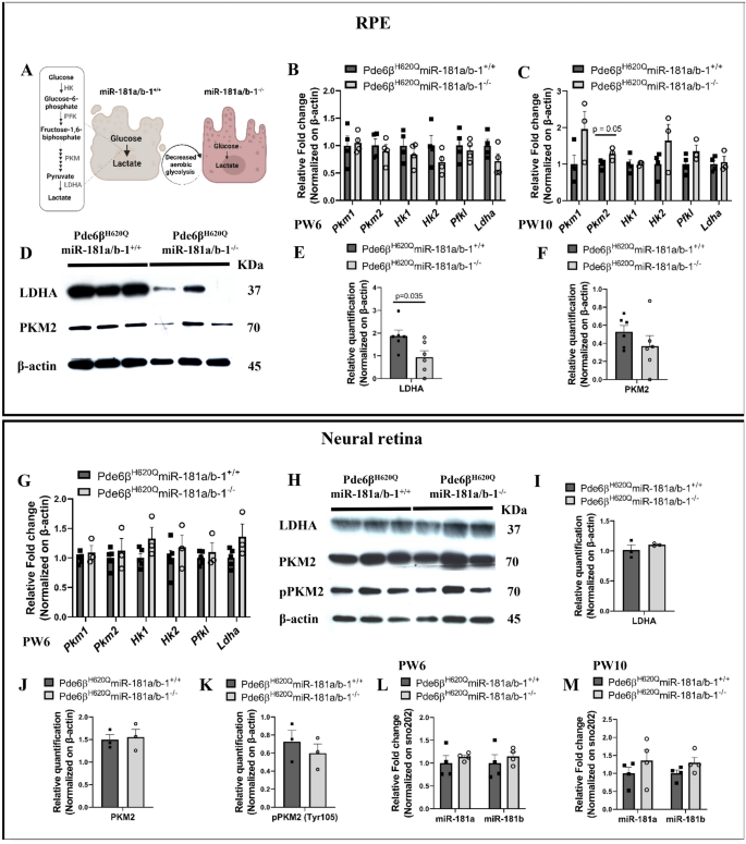 研究过程详述:miR-181a/b的来源为小鼠神经视网膜和视网膜色素上皮组织,验证方法包括实时荧光定量PCR(qPCR)检测表达水平、免疫荧光染色评估表型变化、蛋白质免疫印迹检测下游代谢蛋白表达;特异性方面,神经视网膜中miR-181a/b在疾病中期和晚期显著上调,而视网膜色素上皮中miR-181b从疾病早期开始持续下调,miR-181a随疾病进展逐渐下调,呈现细胞特异性的表达模式;敏感性方面,在疾病早期(PW3)即可检测到视网膜色素上皮中miR-181b的显著下调(n≥4,P<0.05),可作为疾病早期的分子信号。