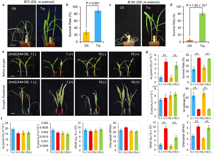 实验目的:验证ZmGLK44基因在玉米干旱响应中的功能,解析其调控色氨酸合成和干旱耐受性的分子机制。