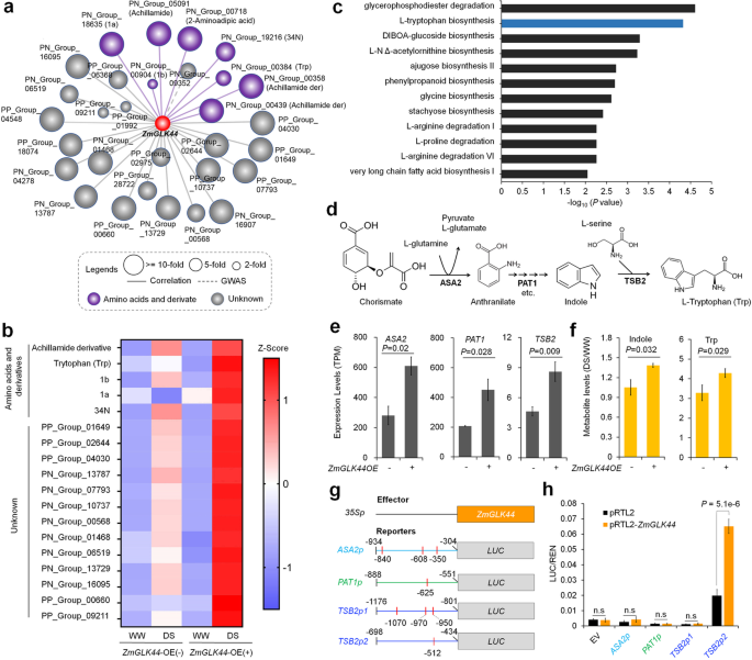 方法细节:构建ZmGLK44诱导型过表达转基因玉米植株,分析转基因植株在DS条件下的代谢组和转录组变化;通过双荧光素酶报告实验验证ZmGLK44对色氨酸合成途径关键基因的调控作用;通过外源施加色氨酸,验证其对玉米干旱耐受性的影响;同时分析转基因植株的干旱相关生理指标(如光合速率、叶绿素含量、离子渗漏率)。
