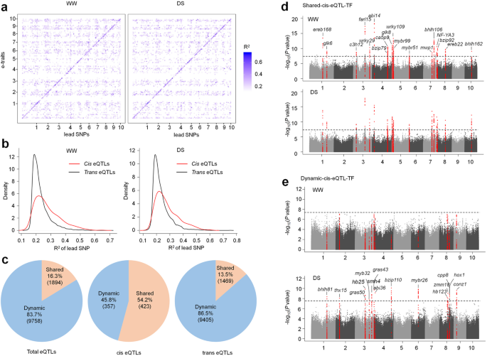结果解读:共检测到7811个与干旱响应代谢物显著关联的SNP,对应3415个mQTL,其中78.6%(2684个)是未被报道过的新干旱响应QTL。DS条件下检测到的显著SNP数量(50.6%)显著多于WW条件(38.7%),且仅有11.6%的SNP在两种条件下均被检测到,表明干旱响应代谢物的遗传调控具有环境特异性(
