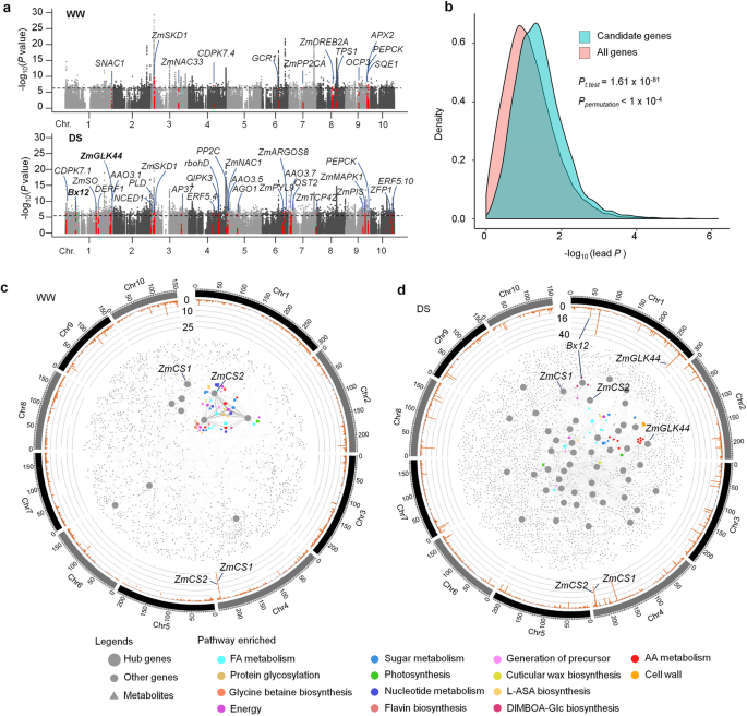 方法细节:利用197份核心自交系在WW和DS条件下的转录组数据,采用混合线性模型(MLM)进行表达数量性状位点(eQTL)分析,鉴定调控候选基因表达的遗传变异。基于代谢组和转录组数据,采用普通最小二乘(OLS)线性模型构建基因-代谢物关联网络,筛选与多个代谢物关联的枢纽基因。