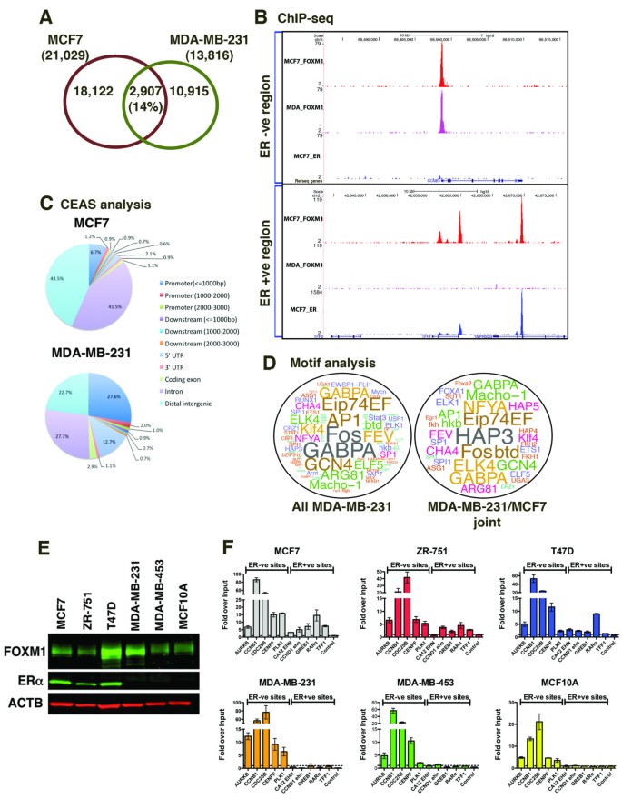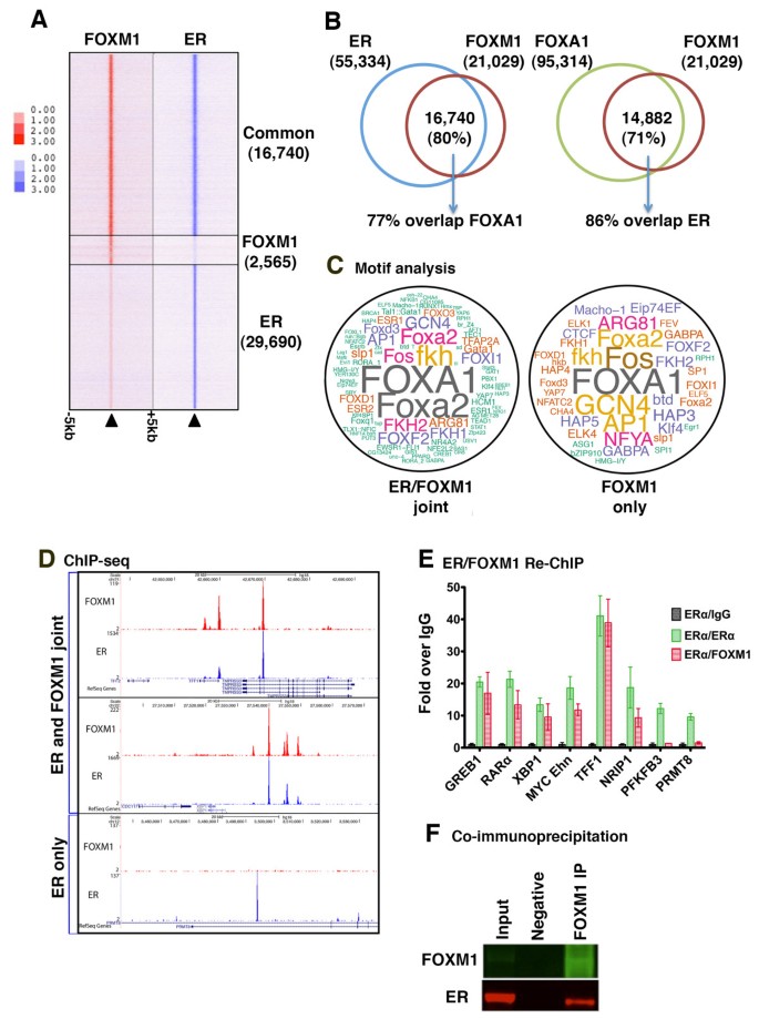 实验目的是对比ERα阳性和阴性乳腺癌细胞中FOXM1的结合模式,明确ERα状态对FOXM1结合的影响。方法细节:在ERα阴性MDA-MB-231细胞中进行2个生物学重复的FOXM1染色质免疫共沉淀结合高通量测序实验,分析FOXM1的结合位点分布,并与MCF7细胞的结合位点进行对比;同时在另外3种ERα阳性细胞系(T47D、ZR-751)和2种ERα阴性细胞系(MDA-MB-453、MCF10A)中,通过染色质免疫共沉淀结合定量PCR验证FOXM1在共结合位点和非共结合位点的结合。结果解读:MDA-MB-231细胞中FOXM1的结合位点与MCF7细胞的重叠仅为14%,其中约52%的共同结合位点位于ERα非结合区域;基因组分布显示,MDA-MB-231细胞中FOXM1约31%的结合位点位于启动子区域,约13%位于5"UTR,而MCF7细胞中仅约9%位于启动子区域,约2%位于5"UTR;在其他ERα阳性细胞系中,FOXM1可结合在ERα结合位点,而在ERα阴性细胞系中则无法结合,提示FOXM1的结合模式具有细胞系特异性,依赖ERα状态。