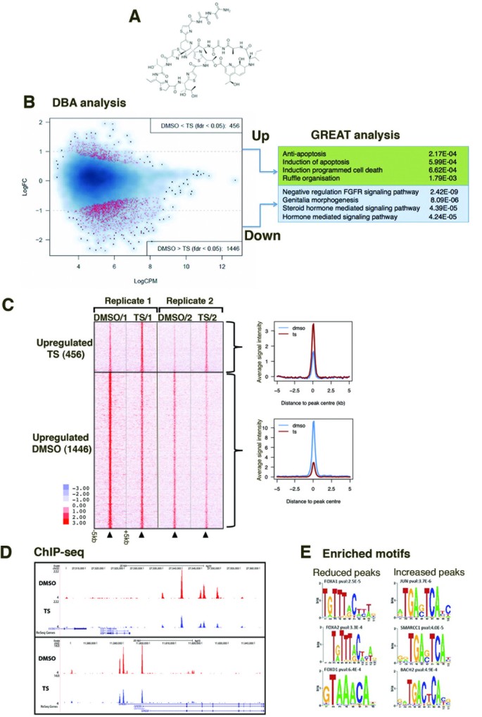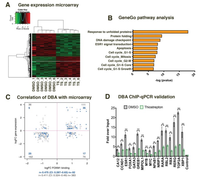 实验目的是验证FOXM1的功能,以及其调控的基因与乳腺癌患者预后的关联。方法细节:用硫链丝菌素(10μM)处理MCF7细胞4小时,通过染色质免疫共沉淀结合高通量测序检测FOXM1结合位点的变化;处理6小时后,通过基因表达芯片检测基因表达变化;通过基因集富集分析、生存分析,将差异结合位点和差异表达基因与乳腺癌患者的临床预后数据关联。结果解读:硫链丝菌素处理后,共检测到1902个差异结合位点,其中约76%的位点FOXM1结合降低,这些位点富集的通路包括类固醇激素信号通路、FGFR信号通路;基因表达芯片显示,处理后有2322个差异表达基因,其中ERα信号通路显著富集;将硫链丝菌素下调的、与FOXM1结合位点距离转录起始位点(TSS)±50kb以内的基因与209例ERα阳性乳腺癌患者的生存数据关联,发现38个基因的高表达与患者的不良预后显著相关(P<10^-6),Kaplan-Meier生存分析显示,该基因签名的高表达与患者复发时间缩短显著相关(P<0.0034),在独立数据集(n=209)中也得到验证(P=0.0094),提示FOXM1调控的基因具有临床预后价值。