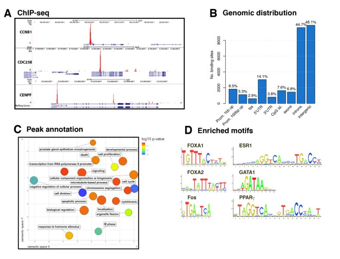 实验目的是系统绘制ERα阳性MCF7细胞中FOXM1的全基因组结合位点,明确其调控的生物学通路和潜在的协同作用因子。方法细节:采用染色质免疫共沉淀结合高通量测序技术,在MCF7细胞中进行4个生物学重复的FOXM1染色质免疫共沉淀实验,对测序数据进行分析,识别FOXM1的结合位点,通过功能注释、基序富集分析明确其调控的通路和潜在的结合基序,同时与已发表的ERα、FOXA1染色质免疫共沉淀数据集进行重叠分析。结果解读:全基因组分析显示,MCF7细胞中FOXM1共检测到21029个离散结合事件,其中约9%的结合位点位于启动子区域,主要调控细胞周期、有丝分裂等通路的基因(如CCNB1、CDC25B),约85%的结合位点位于基因间和内含子区域;功能注释分析显示,FOXM1结合位点富集的生物学过程包括细胞增殖、M期调控、类固醇激素刺激应答等;基序富集分析显示,FOXM1结合区域富集了叉头框、亮氨酸拉链、核受体家族等基序,其中ERα结合基序显著富集;与已发表的ERα染色质免疫共沉淀数据集重叠分析显示,约80%的FOXM1结合位点与ERα结合位点重叠,约71%的FOXM1结合位点与FOXA1结合位点重叠,提示FOXM1与ERα、FOXA1存在协同结合。