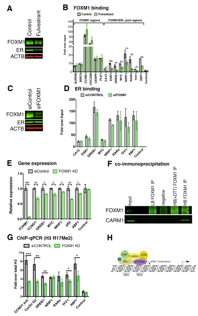 实验目的是探究FOXM1调控ERα转录活性的分子机制。方法细节:通过蛋白质组学筛选FOXM1的相互作用蛋白,聚焦共激活因子CARM1;采用免疫共沉淀实验验证FOXM1与CARM1的直接相互作用;用siRNA敲低FOXM1,通过染色质免疫共沉淀结合定量PCR检测共结合位点的组蛋白H3精氨酸17甲基化水平(CARM1的催化产物)。结果解读:免疫共沉淀实验证实FOXM1与CARM1存在直接相互作用;敲低FOXM1后,共结合位点的组蛋白H3精氨酸17甲基化水平显著降低,提示FOXM1通过招募CARM1到ERα结合位点,促进组蛋白甲基化,从而调控ERα的转录活性。