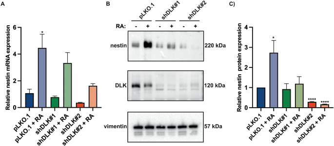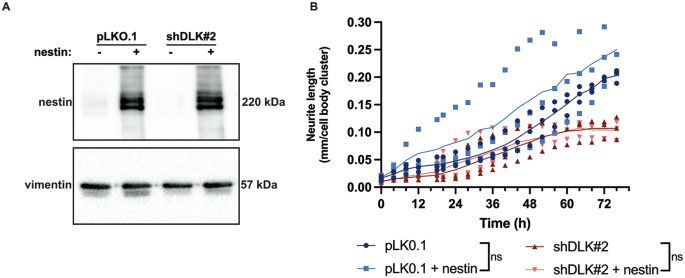 本研究首次发现DLK通过正向调控巢蛋白的转录与表达水平参与神经元分化过程,且该调控作用不依赖于直接磷酸化修饰;创新性在于将DLK信号通路与中间丝蛋白巢蛋白关联,拓展了DLK下游调控网络的覆盖范围;统计学结果显示,DLK敲减组巢蛋白mRNA水平较对照组降低约60%(n=3,P<0.05),总蛋白水平降低约60%(n=3,P<0.0001)。同时研究明确巢蛋白不介导DLK对轴突生长的调控作用,为后续解析DLK调控神经元分化的具体机制排除了非功能性靶点,为神经发育与再生领域的研究提供了新的参考方向。