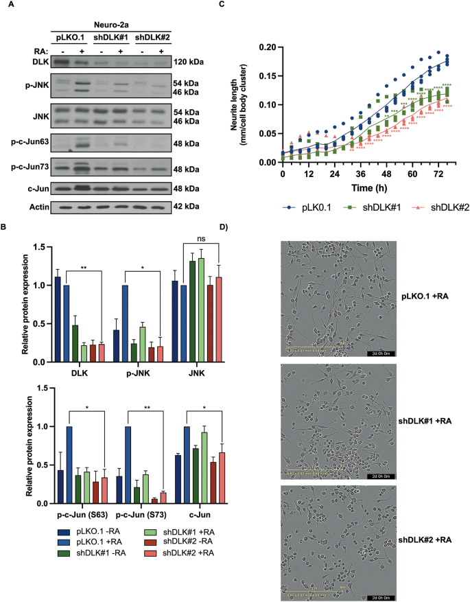 实验目的是建立DLK功能缺失的细胞模型,验证DLK对维甲酸诱导神经元分化的调控作用。方法细节:采用慢病毒载体表达两种靶向DLK的shRNA(shDLK#1、shDLK#2)感染Neuro-2a细胞,经嘌呤霉素筛选获得稳定敲减细胞系;通过免疫印迹检测DLK、磷酸化JNK、磷酸化c-Jun的蛋白水平,利用IncuCyte® S3活细胞分析系统连续72小时监测轴突生长情况。结果解读:免疫印迹结果显示shDLK#2对DLK的敲减效率约75%(n=3,P<0.01),DLK敲减后维甲酸诱导的JNK与c-Jun磷酸化水平显著降低(n=3,P<0.05);轴突生长分析显示,DLK敲减细胞的轴突长度较对照组缩短约40%(n=5,P<0.0001),证实DLK是维甲酸诱导Neuro-2a细胞轴突生长的必需因子。