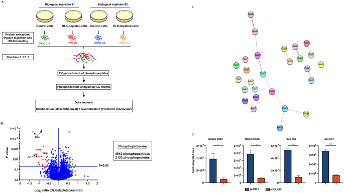 实验目的是系统鉴定DLK调控的下游磷酸化蛋白质。方法细节:将对照组与DLK敲减组细胞用20μM维甲酸处理24小时,提取总蛋白后采用iTRAQ试剂标记肽段,通过TiO2磁珠富集磷酸化肽段,利用纳米液相色谱-串联质谱(nanoLC-MS/MS)进行检测,借助Proteome Discoverer软件分析差异磷酸化肽段(筛选标准:P<0.05,z score>2)。结果解读:共鉴定到4942个磷酸化肽段,其中32个肽段的丰度在DLK敲减组中发生显著变化,对应27个差异磷酸化蛋白质;STRING互作网络分析显示这些蛋白主要富集于神经系统发育相关通路,其中巢蛋白的两个磷酸化肽段(Ser-894、Ser-1837)丰度降低最为显著(n=2,P<0.05)。