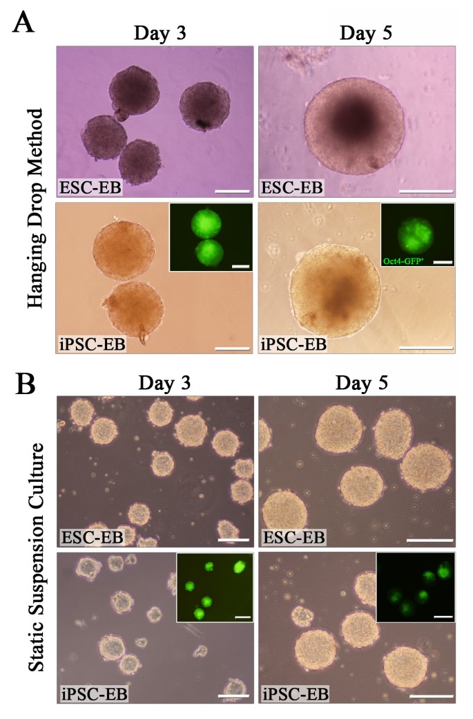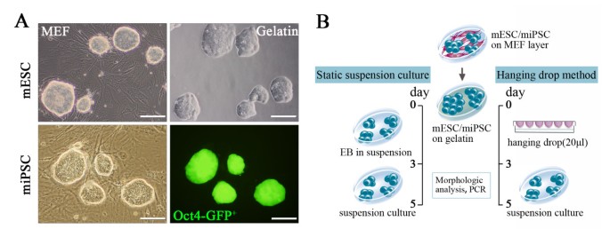 实验目的为建立稳定的miPSC及小鼠ESC(mESC)培养体系,构建EB形成的体外模型,为后续分子机制研究提供实验基础。方法细节方面,研究人员培养携带Oct4-eGFP报告基因的miPSC及mESC,分别采用悬滴法和静态悬浮法诱导EB形成,悬滴法通过控制细胞数量保证EB均一性,静态悬浮法允许细胞自发聚集,在分化第3、5天通过光学显微镜及荧光显微镜观察EB形态。结果解读显示,未分化的miPSC在饲养层或明胶包被板上的形态与mESC高度相似,均呈现典型的干细胞克隆形态;两种诱导方法均能成功形成EB,第3、5天的EB形态与mESC来源EB一致,Oct4-eGFP荧光信号随分化进程逐渐减弱,提示多能性的丧失。
