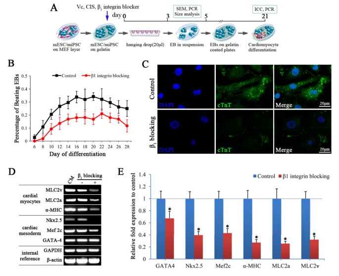 实验目的为明确阻断I型胶原/β₁整合素相互作用对miPSC来源EB心脏分化潜能的影响。方法细节为将分化第5天的EB接种于明胶包被板,从分化第6天开始每日观察自发搏动EB的比例,第21天通过免疫染色检测心肌肌钙蛋白T(cTnT)的表达,采用半定量RT-PCR和实时定量PCR检测心脏相关转录因子及结构基因的表达。结果解读显示,阻断组的自发搏动EB比例显著低于对照组,在分化第16天达到平台期时,阻断组比例为18.0±3.0%,对照组为33.8±4.4%(n=3,P<0.05);免疫染色显示阻断组心肌肌钙蛋白T阳性细胞数量减少,肌丝排列紊乱;心脏相关转录因子(GATA-4、Nkx2.5、Mef2c)及结构基因(α-MHC、MLC2a、MLC2v)的mRNA表达均显著下调(n=3,P<0.05),提示该相互作用的阻断显著抑制了miPSC的心脏分化能力。