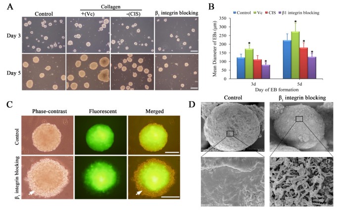 实验目的为验证I型胶原/β₁整合素相互作用对EB生长及结构形成的调控功能。方法细节为在EB形成前分别添加Vc(胶原合成刺激剂,100μM)、CIS(胶原合成抑制剂,300μM)或β₁整合素阻断抗体(10μg/ml),采用静态悬浮法和悬滴法诱导EB形成,在分化第5天测量EB直径,通过扫描电镜观察EB表面结构。结果解读显示,静态悬浮培养体系中,Vc处理组EB平均直径增大至263.3±59.6μm,CIS处理组减小至179.6±30.3μm,β₁整合素阻断组减小更为显著,平均直径为127.0±22.2μm(n=50,P<0.05);悬滴法形成的EB大小不受阻断影响,但无法形成对照组中典型的致密原始内胚层壳状结构,扫描电镜显示阻断组EB表面呈纤毛状,缺乏对照组的光滑ECM涂层,提示该相互作用是EB结构形成的必需条件。