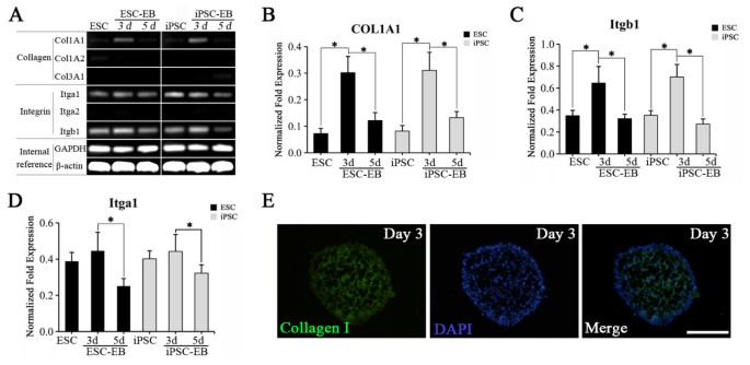 实验目的为分析EB形成过程中胶原及其整合素受体的时序表达变化,筛选潜在的功能相互作用分子对。方法细节包括采用半定量RT-PCR检测未分化细胞及分化第3、5天EB中I型胶原(Col1A1、Col1A2)、III型胶原(Col3A1)及整合素α₁、α₂、β₁的mRNA表达,通过实时定量PCR验证关键分子的表达趋势,同时对第3天EB进行免疫染色检测I型胶原的蛋白表达。结果解读表明,未分化的mESC和miPSC仅表达整合素α₁和β₁,不表达I型胶原;在EB形成过程中,Col1A1和β₁整合素(Itgb1)的mRNA表达协同上调,在分化第3天达到峰值,随后下降至未分化细胞水平,免疫染色结果显示第3天EB中存在I型胶原的蛋白表达,提示该分子对在EB形成的关键阶段发挥调控作用。