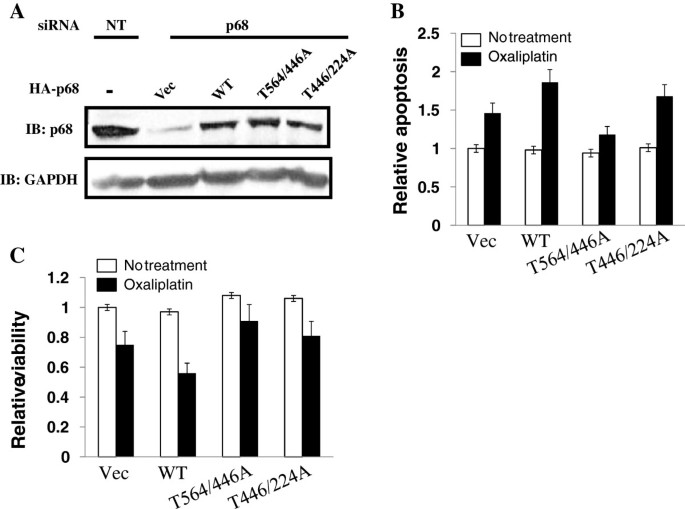 方法细节:采用siRNA敲低HCT116细胞内源性p68,分别过表达野生型p68及T564/446A双突变体;用10μM奥沙利铂处理24小时后,采用caspase-3活性检测试剂盒检测细胞凋亡率,同时采用噻唑蓝(MTT)实验检测细胞活力。