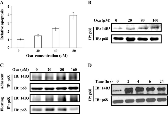 方法细节:采用人结直肠癌细胞系HCT116,分别用不同浓度(0-20μM)奥沙利铂处理24小时,或20μM奥沙利铂处理不同时间(0-24小时),通过免疫沉淀富集细胞内p68蛋白,再用抗磷酸化苏氨酸抗体进行免疫印迹(WB)检测;同时采用商业化凋亡试剂盒检测细胞凋亡率,区分漂浮细胞与贴壁细胞分别分析。