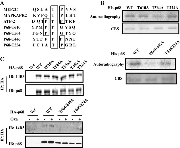实验目的:鉴定p38丝裂原活化蛋白激酶磷酸化p68的具体苏氨酸位点。