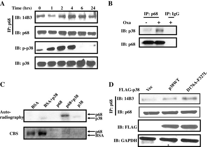 方法细节:在HCT116细胞中同步检测奥沙利铂处理后p38的激活状态(磷酸化水平)与p68的苏氨酸磷酸化水平;通过免疫共沉淀实验检测p68与p38的相互作用;采用体外激酶实验,将重组p68蛋白与重组p38蛋白共孵育,加入[γ-32P]-ATP后通过放射自显影检测磷酸化;同时在细胞中过表达野生型p38及组成型激活突变体D176A-F327L,检测p68的苏氨酸磷酸化变化。