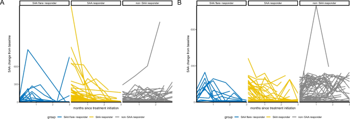 实验目的:确定符合入组标准的晚期NSCLC患者,并基于治疗早期的SAA动力学模式完成分组,为后续生存分析奠定基础。方法细节:回顾性纳入2016年8月至2024年12月期间,中山大学肿瘤防治中心接受一线PD-(L)1抑制剂单药或联合铂类化疗的242例无驱动基因突变的晚期NSCLC患者;在治疗开始后的12周内定期采集患者血清样本,检测SAA水平,并参考Fukuda等提出的flare应答定义,将患者分为flare应答组(SAA先升高后降至基线以下)、持续应答组(SAA持续下降)、无应答组(SAA无下降或持续升高)。结果解读:各组患者的基线特征差异在表1中呈现(文献未明确具体差异数据),图1展示了化疗免疫治疗组与免疫单药组中SAA水平随时间的变化趋势,两组中均清晰呈现三种不同的动力学模式,为后续分组分析提供了依据。