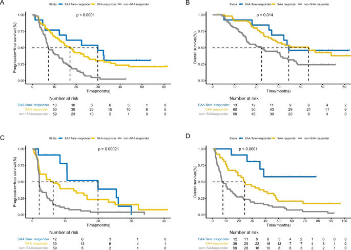本研究的核心创新在于首次将SAA的早期动力学模式(flare应答,即先升高后降至基线以下的变化)应用于晚期NSCLC的一线化疗免疫治疗及免疫单药治疗的疗效预测,弥补了SAA动态变化在化疗免疫治疗中研究的空白。与现有静态生物标志物相比,SAA动力学模式能更精准地反映治疗过程中系统性炎症与抗肿瘤免疫应答的动态交互作用,且作为低成本的常规检测指标,具有更高的临床可及性,为晚期NSCLC患者的疗效预判与动态监测提供了新的选择。