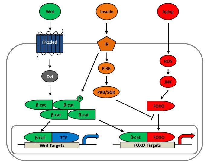 方法细节:回顾领域内关于β-catenin与FOXO蛋白互作的研究,分析氧化应激、衰老、胰岛素对这种互作的调控,以及其对代谢稳态的影响。