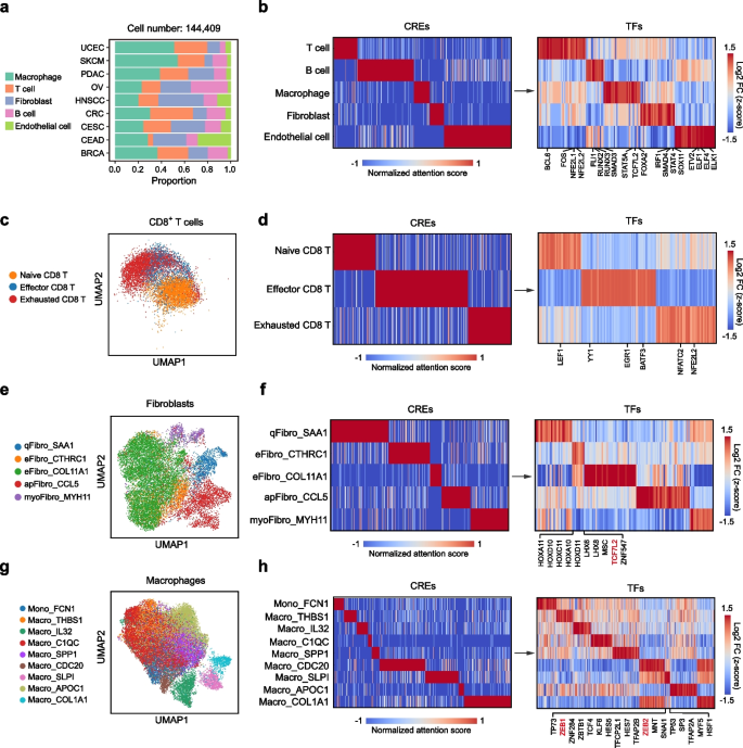 实验目的是验证Cisformer在大规模复杂数据集上的可扩展性,解析肿瘤微环境中的转录调控异质性。方法细节上,将Cisformer应用于包含144409个细胞的泛癌单细胞多组学数据集,分析五种主要非肿瘤细胞类型(巨噬细胞、T细胞、成纤维细胞、B细胞、内皮细胞)的细胞类型特异性顺式调控元件和转录因子;进一步细分CD8+T细胞、成纤维细胞、巨噬细胞亚型,识别亚型特异性调控因子。结果解读显示,Cisformer成功识别出B细胞中的FLI1、RUNX2、RUNX3,内皮细胞中的ETV2、ELF1等细胞类型特异性转录因子,这些转录因子均已被报道参与对应细胞的发育与功能调控;在CD8+T细胞亚型中,识别出耗竭T细胞中的NFATC2、NFE2L2等调控因子,成纤维细胞中的TCF7L2,巨噬细胞中的ZEB1、ZEB2等亚型特异性转录因子,揭示了肿瘤微环境中细胞亚型的转录调控异质性。产品关联:文献未提及具体实验产品,领域常规使用HTAN泛癌单细胞多组学数据集。
