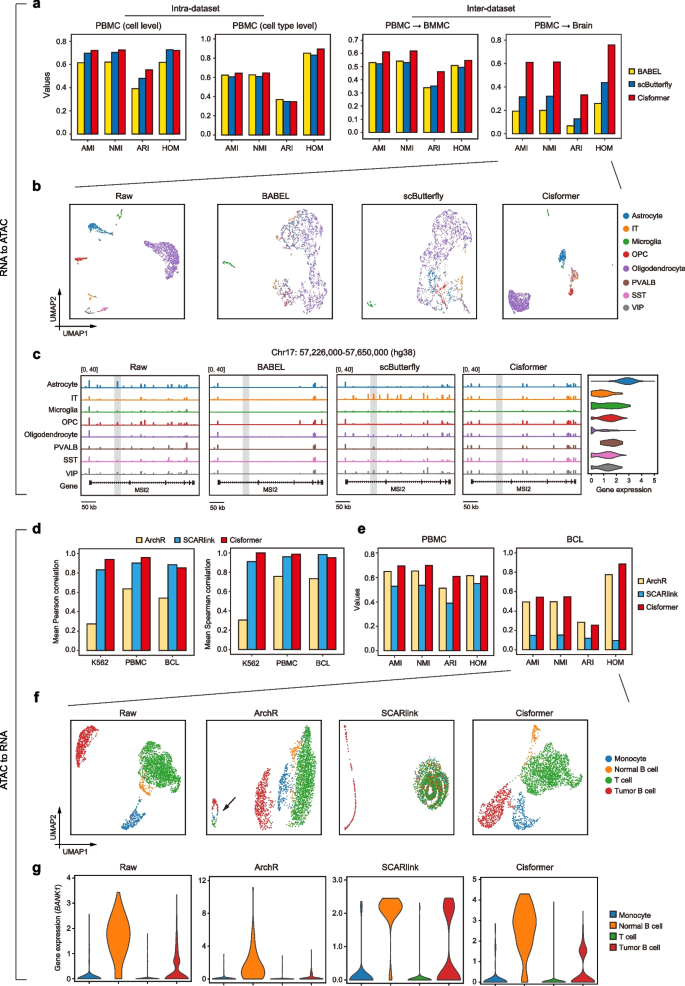 实验目的是全面验证Cisformer在跨模态生成任务中的准确性和泛化能力。方法细节上,设置四种RNA到染色质可及性的测试场景:数据集内细胞水平随机拆分(intra-dataset 1)、数据集内细胞类型水平拆分(intra-dataset 2)、同组织跨数据集预测(inter-dataset 1)、异组织跨数据集预测(inter-dataset 2),对比BABEL和scButterfly两种方法;染色质可及性到RNA任务对比ArchR和SCARlink,采用细胞聚类指标(调整互信息AMI、归一化互信息NMI、调整兰德指数ARI、同质性分数HOM)、基因表达相关性(Pearson、Spearman)、峰识别精确率/召回率/F1分数等评估指标。结果解读显示,在所有RNA到染色质可及性测试场景中,Cisformer的细胞聚类指标均显著优于对比方法,其中异组织跨数据集场景下,Cisformer生成的染色质可及性谱的细胞聚类结果与原始数据高度一致,而BABEL和scButterfly仅能区分少数细胞类型;染色质可及性到RNA任务中,Cisformer的基因表达预测与原始数据的平均Pearson相关性在PBMC、K562、BCL数据集上均优于对比方法,细胞聚类性能也显著提升。产品关联:文献未提及具体实验产品,领域常规使用10X Genomics单细胞多组学数据集、UK Biobank GWAS数据集等公共数据资源。