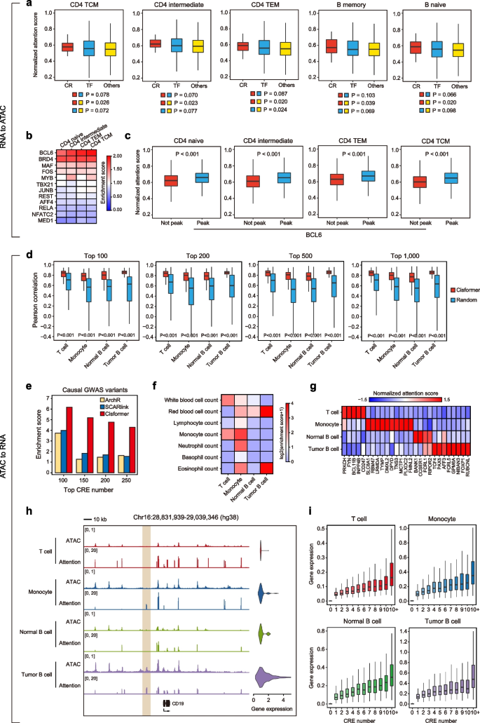 实验目的是验证Cisformer能否捕捉转录组与表观基因组之间的真实调控关系,实现生物学可解释性。方法细节上,提取模型的交叉注意力分数,分析染色质重塑因子、转录因子及其他基因的注意力分布;结合CD4+T细胞的ChIP-seq数据,验证Cisformer预测的转录因子结合位点准确性;分析高置信度顺式调控元件-基因对的表达相关性,评估因果GWAS变异在顺式调控元件中的富集程度。结果解读显示,染色质重塑因子基因的注意力分数显著高于转录因子基因和其他基因(P<0.01,n=PBMC数据集9964个细胞),符合染色质重塑因子对染色质可及性的全基因组调控作用;Cisformer预测的BCL6、BRD4等转录因子结合位点与ChIP-seq数据的富集分数显著高于随机背景(P<0.05,n=CD4+T细胞亚型样本量);高置信度顺式调控元件-基因对的表达相关性显著高于随机对(P<0.01,n=BCL数据集14566个细胞),因果GWAS变异在Cisformer识别的顺式调控元件中的富集分数显著高于ArchR和SCARlink,证明模型能够准确捕捉顺式调控元件与靶基因的调控关系。产品关联:文献未提及具体实验产品,领域常规使用ReMap数据库ChIP-seq数据、UK Biobank GWAS数据。