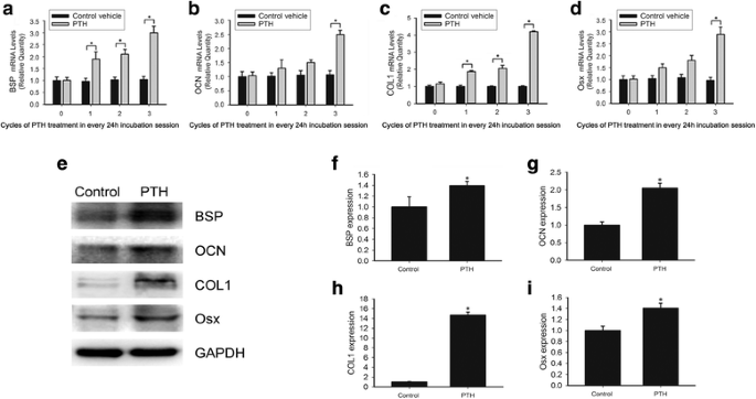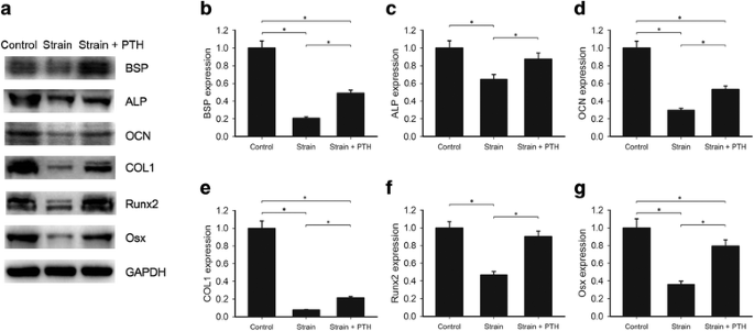 实验目的是验证间歇性PTH是否可逆转机械应变对成牙骨质细胞的不良影响。方法细节为:先对OCCM-30细胞施加18h机械应变,再给予3个周期间歇性PTH处理,采用蛋白质免疫印迹检测牙骨质形成及分化相关蛋白的表达水平。结果解读:机械应变组BSP、碱性磷酸酶、OCN、COL1蛋白表达分别降至对照组的20%、64%、29%、8%,而机械应变+PTH组分别回升至49%、88%、53%、21%(n=3,P<0.05);Runx2和Osx蛋白表达在机械应变组为对照组的47%和36%,在机械应变+PTH组回升至90%和79%(n=3,P<0.05),证实间歇性PTH可显著缓解机械应变对成牙骨质细胞的分解效应。实验所用关键产品:抗BSP、碱性磷酸酶、OCN、COL1、Runx2、Osx抗体(Abcam、Biorbyt,英国)。