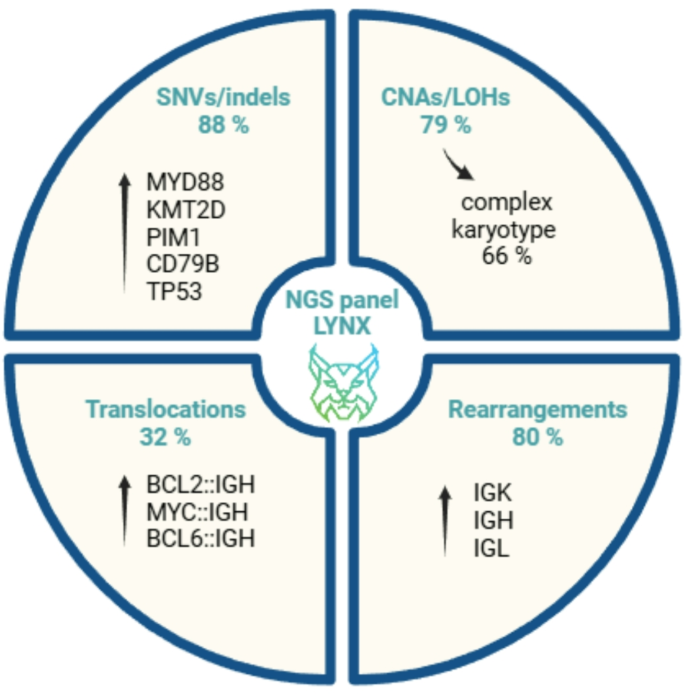 实验目的是对比多靶点与单靶点检测的灵敏度,明确不同样本类型的ctDNA检测性能。方法细节:使用定制LYNX NGS panel(覆盖1.13Mb目标区域,可检测基因变异、染色体畸变、抗原受体重排,检测限5%)对cfDNA样本进行分析,当cfDNA量不足25ng时采用数字PCR(dPCR)检测MYD88 L265P突变;ctDNA水平以单倍体基因组当量/毫升(hGE/ml)表示,阳性定义为至少一个标志物高于检测限。结果解读:多靶点NGS检测CNS浸润的阳性率达90%,远高于单靶点MYD88检测的46%(P=0.001);脑脊液ctDNA检测阳性率为91%,显著高于血浆(仅SCNSL患者中部分阳性),且远高于流式细胞术的21%(P<0.001);联合分析脑脊液cfDNA和gDNA可进一步提升检测阳性率。产品关联:实验所用关键产品:定制LYNX NGS panel;数字PCR平台(文献未明确品牌,领域常规使用Bio-Rad或Thermo Fisher Scientific的dPCR系统)。