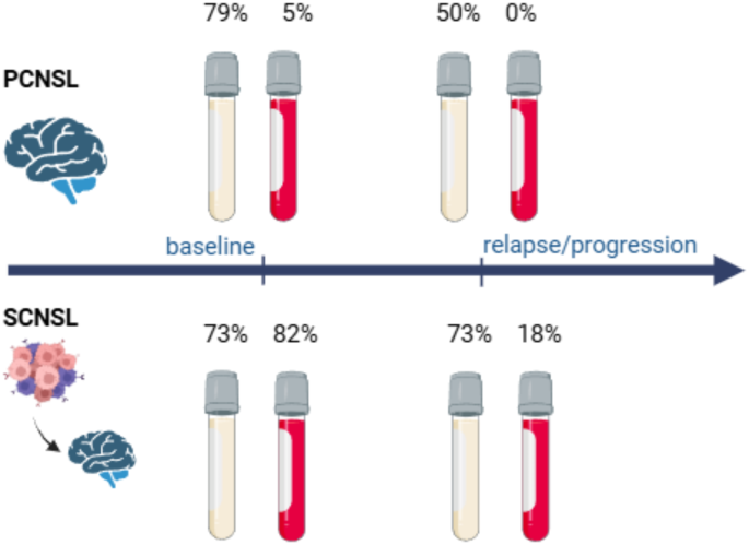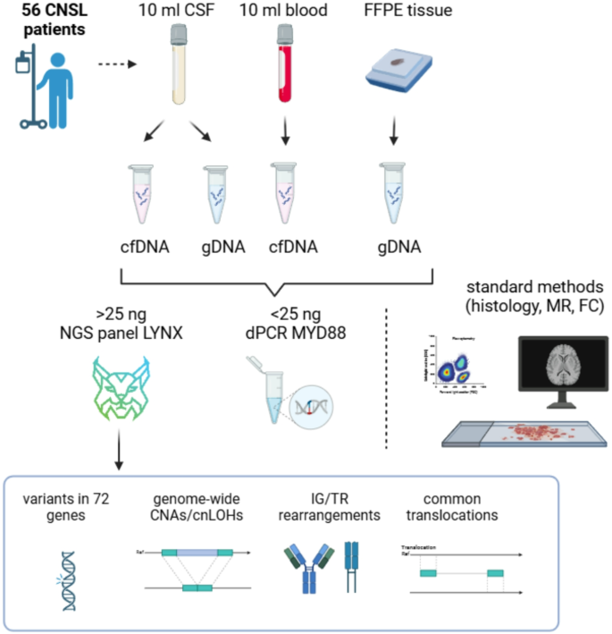 实验目的是建立具有代表性的CNSL患者队列,获取匹配的液体活检和组织样本以支持多维度分析。方法细节:纳入2021-2023年捷克布尔诺大学医院的56例CNSL患者(25例PCNSL,31例SCNSL),其中16例为复发患者,收集61份脑脊液、61份血浆及42份福尔马林固定石蜡包埋(FFPE)组织样本;脑脊液采集中位数体积10ml,血浆4ml,28例患者接受过糖皮质激素治疗(地塞米松8mg每日3次,中位疗程5天);样本采集遵循临床常规流程,FFPE组织样本回顾性从生物库获取。结果解读:队列中位年龄67岁,中位随访14个月,覆盖初诊、复发及不同治疗阶段患者,样本类型全面,为真实世界研究提供了可靠的临床数据基础;糖皮质激素治疗未显著影响脑脊液cfDNA和ctDNA水平(P<0.14和P<0.98),排除了治疗干扰对检测结果的影响。产品关联:文献未提及具体样本采集产品,领域常规使用STRECK cfDNA保存管用于液体活检样本收集。