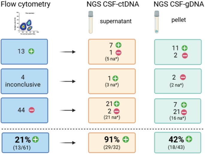 实验目的是获取高质量的游离DNA(cfDNA)和基因组DNA(gDNA),为后续检测提供合格的核酸模板。方法细节:血浆样本经两次离心(300g 20min、5000g 10min)分离,脑脊液样本离心分离上清(用于cfDNA提取)和沉淀(用于gDNA提取);cfDNA采用QIAamp Circulating Nucleic Acids试剂盒提取,gDNA分别采用QIAamp DNA Blood Mini Kit(脑脊液沉淀)和QIAamp DNA FFPE tissue kit(FFPE组织)提取;通过Agilent cfDNA ScreenTape检测cfDNA质量,Qubit荧光定量仪检测核酸浓度。结果解读:脑脊液cfDNA中位数浓度低于血浆,但ctDNA检测性能更优;脑脊液cfDNA与ctDNA水平呈正相关(P<0.003),血浆中两者也呈正相关(P<0.001),提示cfDNA浓度可作为ctDNA检测的初步评估指标。产品关联:实验所用关键产品:Qiagen的QIAamp Circulating Nucleic Acids试剂盒、QIAamp DNA Blood Mini Kit、QIAamp DNA FFPE tissue kit;Agilent的cfDNA ScreenTape assay;Thermo Fisher Scientific的Qubit fluorimeter。