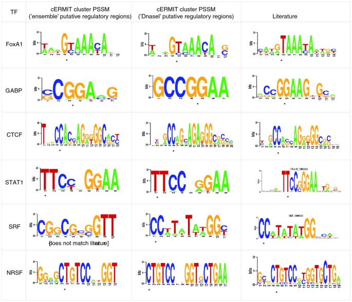 方法细节:处理6个人类转录因子ChIP-seq数据集(STAT1、CTCF、SRF、GABP、FoxA1、NRSF)和12个小鼠胚胎干细胞ChIP-seq数据集(cMyc、nMyc、E2f1等);采用两种方式定义推定调控区域:一是基于DNaseI超敏感位点(DHS)的开放染色质区域,二是基于多因子ChIP-seq峰的“ensemble”集合;通过与TRANSFAC数据库中的已知位置特异性评分矩阵比较评估预测准确性。