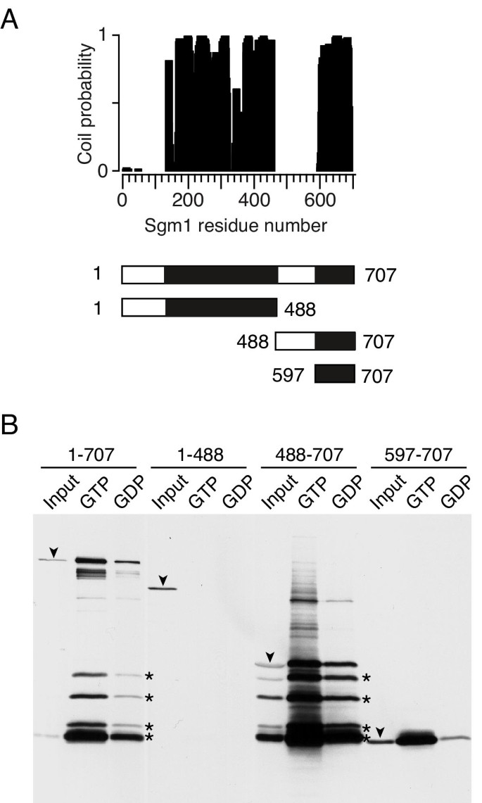 ,全长Sgm1及488-707、597-707片段可优先结合Ypt6的GTP活化形式,而1-488片段无结合活性,说明Sgm1的C端卷曲螺旋域(597-707氨基酸)是Ypt6的结合位点。产品关联:文献未提及具体实验产品,领域常规使用GST融合蛋白表达系统、Protein A标签免疫检测试剂、免疫印迹相关试剂等。