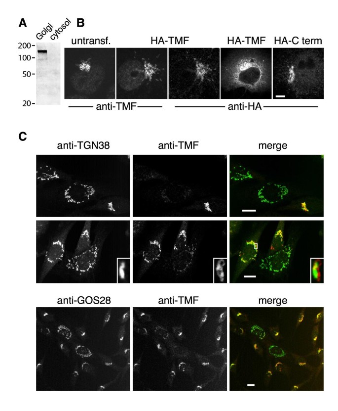 实验目的:明确TMF在哺乳动物细胞中的亚细胞定位,验证其高尔基体相关属性。方法细节:制备针对TMF N端1-280氨基酸的多克隆抗体,通过亚细胞组分分离实验提取大鼠肝脏的高尔基体组分与胞质组分,免疫印迹检测TMF的分布;在COS细胞中进行免疫荧光染色,检测内源性TMF的定位,同时转染HA标签的全长TMF及C端片段,通过抗HA与抗TMF抗体的共染色验证定位的特异性,使用高尔基体标志物TGN38、GOS28进行共定位分析。结果解读:如图4所示,