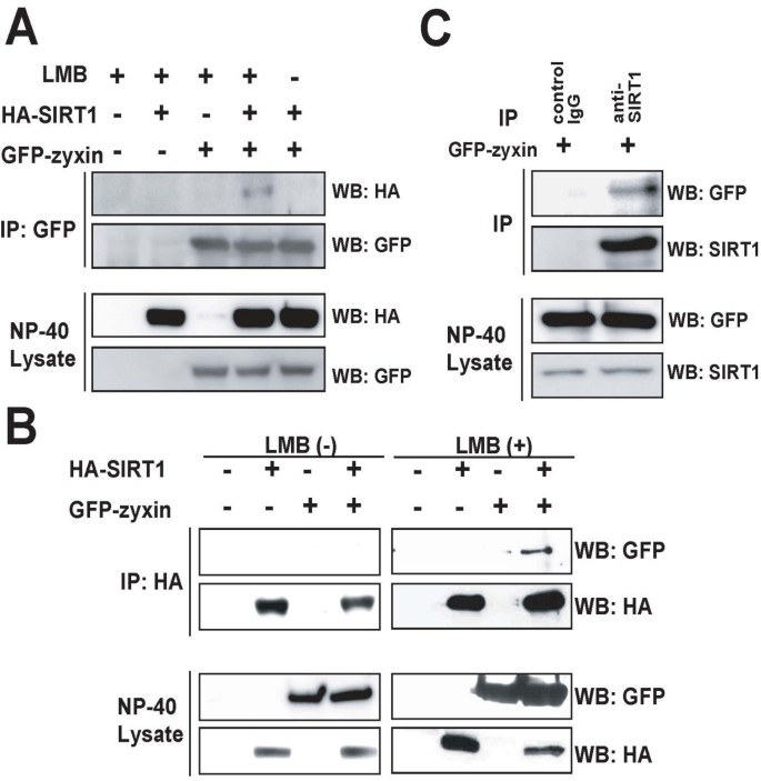 方法细节:在HEK293T细胞中共转染HA标签SIRT1和GFP标签zyxin质粒,LMB处理6小时后裂解细胞,分别用抗GFP抗体和抗HA抗体进行免疫沉淀,通过免疫印迹检测相互作用的蛋白;同时在HEK293T细胞中单独转染GFP-zyxin质粒,用抗SIRT1抗体免疫沉淀内源性SIRT1,检测其与GFP-zyxin的结合。
