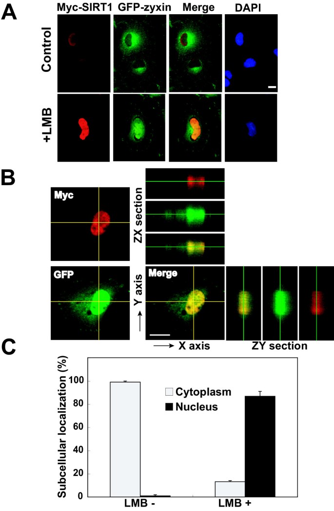 方法细节:在COS-7细胞中共转染Myc标签SIRT1和GFP标签zyxin质粒,培养42小时后用核输出抑制剂雷帕霉素B(LMB)处理6小时,通过免疫荧光(免疫荧光,IF)染色标记Myc-SIRT1,利用激光共聚焦显微镜观察蛋白定位,同时统计LMB处理后核内zyxin积累的细胞比例。