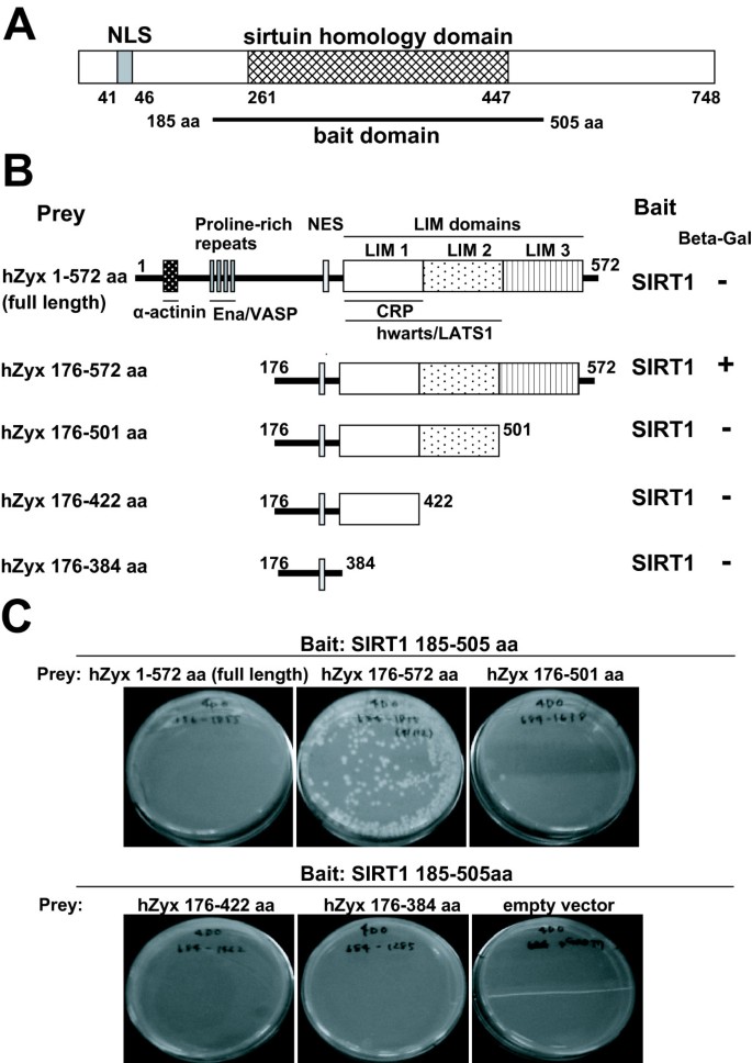 结果解读:筛选得到5个与zyxin C端片段同源的阳性克隆,结合区域定位实验显示,仅包含zyxin LIM3结构域(501-572氨基酸)的片段可与SIRT1催化结构域结合,而全长zyxin在酵母中未检测到结合信号;推测:全长zyxin的LIM1/2结构域可能处于掩盖状态,需要特定翻译后修饰才能暴露LIM3结构域的结合位点。