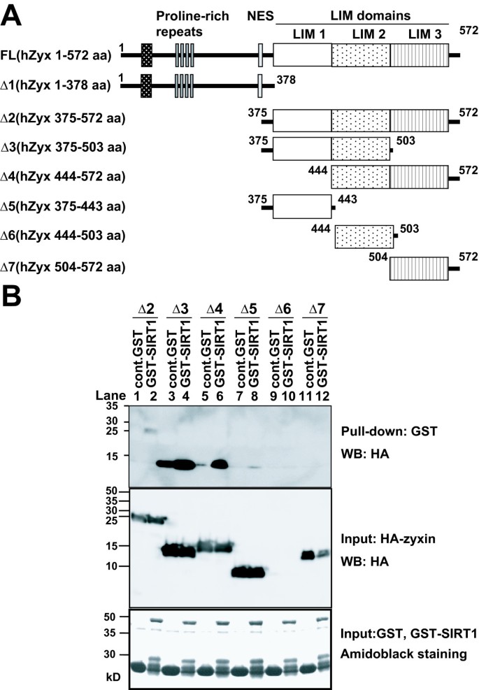 结果解读:免疫印迹结果显示,GST-SIRT1与zyxin的444-572氨基酸片段(包含LIM2-3结构域)结合信号最强,与375-572氨基酸片段结合信号较弱,进一步证实zyxin的C端区域(尤其是LIM3结构域)是与SIRT1结合的关键区域;其中zyxin 375-503氨基酸片段出现非特异性结合,无法评估其与SIRT1的特异性相互作用。