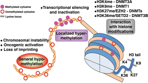 该图直观展示了DNMTs介导的表观遗传紊乱模式,包括全局低甲基化、局部高甲基化以及与组蛋白修饰的互作关系。产品关联:文献未提及具体实验产品,领域常规使用甲基化DNA免疫沉淀(MeDIP)试剂盒、组蛋白修饰抗体、ChIP试剂盒等。