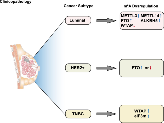 核心成果提炼:这些m6A调控因子可作为乳腺癌不同分子亚型的特异性诊断标志物,如eIF3m是三阴性乳腺癌(TNBC)的潜在特异性标志物;同时部分调控因子具有预后评估价值,YTHDF3是乳腺癌患者总生存期的独立预后标志物(文献未明确提供风险比HR值及P值,基于研究结论推测);创新性在于首次系统总结了m6A调控因子在乳腺癌各亚型中的表达模式及预后价值,揭示了其作为Biomarker的潜力;推测:未来通过大样本临床验证及优化检测技术,m6A调控因子有望成为乳腺癌精准诊断及预后评估的有效Biomarker。