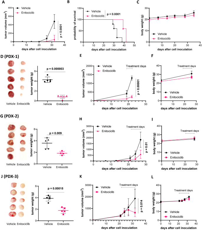 实验目的为验证Enitociclib在体内MCL耐药模型中的抗肿瘤活性及安全性。研究首先构建JeKo-1细胞系异种移植模型(CDX),给予Enitociclib(10mg/kg,静脉注射,每周2次),结果显示Enitociclib显著抑制肿瘤生长(P<0.0001),延长小鼠生存期(P<0.0001),且未导致小鼠体重显著下降,提示其具有良好的体内安全性。进一步构建3例患者来源异种移植模型(PDX),分别对应BTK抑制剂耐药、BTK抑制剂-维奈克拉双重耐药、BTK抑制剂-CAR-T双重耐药的临床样本,Enitociclib在所有PDX模型中均显著抑制肿瘤生长,其中BTK抑制剂耐药模型的肿瘤生长抑制率对应的P值为0.00015,BTK抑制剂-维奈克拉双重耐药模型为0.009,BTK抑制剂-CAR-T双重耐药模型为0.000003,且所有模型中小鼠体重均无显著变化,证实Enitociclib可有效克服多种类型的MCL治疗耐药。文献未提及具体实验产品,领域常规使用免疫缺陷小鼠(NSG)、肿瘤体积测量工具等。
