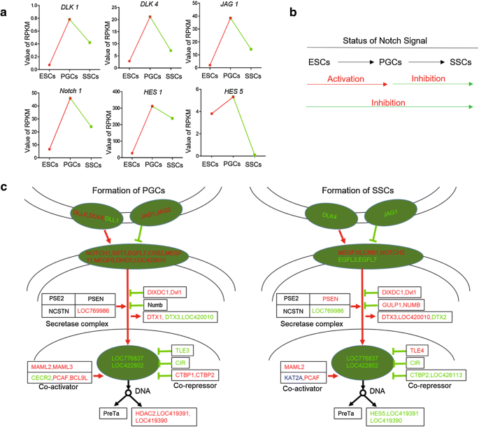 实验目的是从全基因组水平解析Notch信号对PGCs和SSCs的调控通路,筛选参与复合物调控的关键分子。方法细节为对鸡ESCs、PGCs、SSCs进行转录组测序,分析Notch信号通路关键分子的表达模式,筛选差异表达的调控因子。结果显示,Notch信号在ESCs向PGCs分化过程中显著上调,在PGCs向SSCs分化过程中显著下调;差异表达基因分析发现,转导样增强子分裂3(TLE3)、TLE4和C端结合蛋白2(CTBP2)在PGCs向SSCs分化过程中表达显著上调,这些分子参与调控CBF-1/RBP共抑制复合物的解离逆转,对应图6。实验所用关键产品:转录组测序服务,文献未提及具体服务商信息。