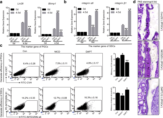 实验目的是直接验证Notch信号对鸡PGCs和SSCs形成效率的调控作用,明确其双向调控效应。方法细节为在鸡胚胎中分别过表达和抑制NICD,通过实时荧光定量PCR检测PGCs标记物Lin28、Blimp1和SSCs标记物integrin α6、integrin β1的mRNA表达水平;通过流式细胞术(FACS)检测CVH+CKIT+ PGCs和integrin α6+integrin β1+ SSCs的形成效率;通过过碘酸-希夫(PAS)染色观察PGCs和SSCs的形态与数量变化。结果显示,过表达NICD显著上调Lin28和Blimp1的表达(P<0.05),下调integrin α6和integrin β1的表达(P<0.05);流式细胞术结果显示,过表达NICD后PGCs的形成效率为7.5%±0.11(n=3,P<0.05),显著高于抑制组的4.9%±0.17(n=3,P<0.05);SSCs的形成效率为12.7%±0.08(n=3,P<0.05),显著低于抑制组的16.3%±0.16(n=3,P<0.05);PAS染色结果显示,过表达NICD显著增加PGCs的数量,抑制NICD则减少PGCs数量,SSCs的变化趋势相反,说明Notch信号对PGCs形成起正调控作用,对SSCs形成起负调控作用,对应图3。