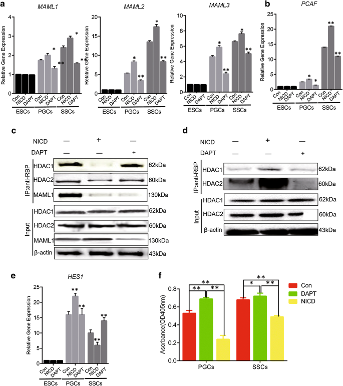实验目的是解析Notch信号调控下游基因表达的分子机制,明确CBF-1/RBP复合物在其中的作用。方法细节为采用免疫共沉淀(Co-IP)技术,分别在PGCs和SSCs中检测CBF-1/RBP复合物的组成变化,通过抗RBP抗体沉淀复合物后,检测组蛋白去乙酰化酶(HDAC)1、HDAC2和MAML1的结合水平;同时采用比色法检测HDAC的酶活性,通过实时荧光定量PCR检测下游转录因子HES1的表达水平。结果显示,在PGCs中,激活Notch信号导致CBF-1/RBP共抑制复合物解离,HDAC1和HDAC2在复合物中的富集水平显著降低,同时MAML1与复合物结合形成共激活复合物,HDAC酶活性显著降低,HES1的表达显著上调(P<0.05);在SSCs中,该解离过程发生逆转,HDAC1和HDAC2的富集水平显著增加,HDAC酶活性升高,HES1的表达显著下调(P<0.05);推测:HES5可能受其他表观遗传因子调控,需进一步实验验证。说明Notch信号通过调控CBF-1/RBP复合物的组成变化和组蛋白乙酰化水平,实现对下游基因的双向调控,对应图2。
